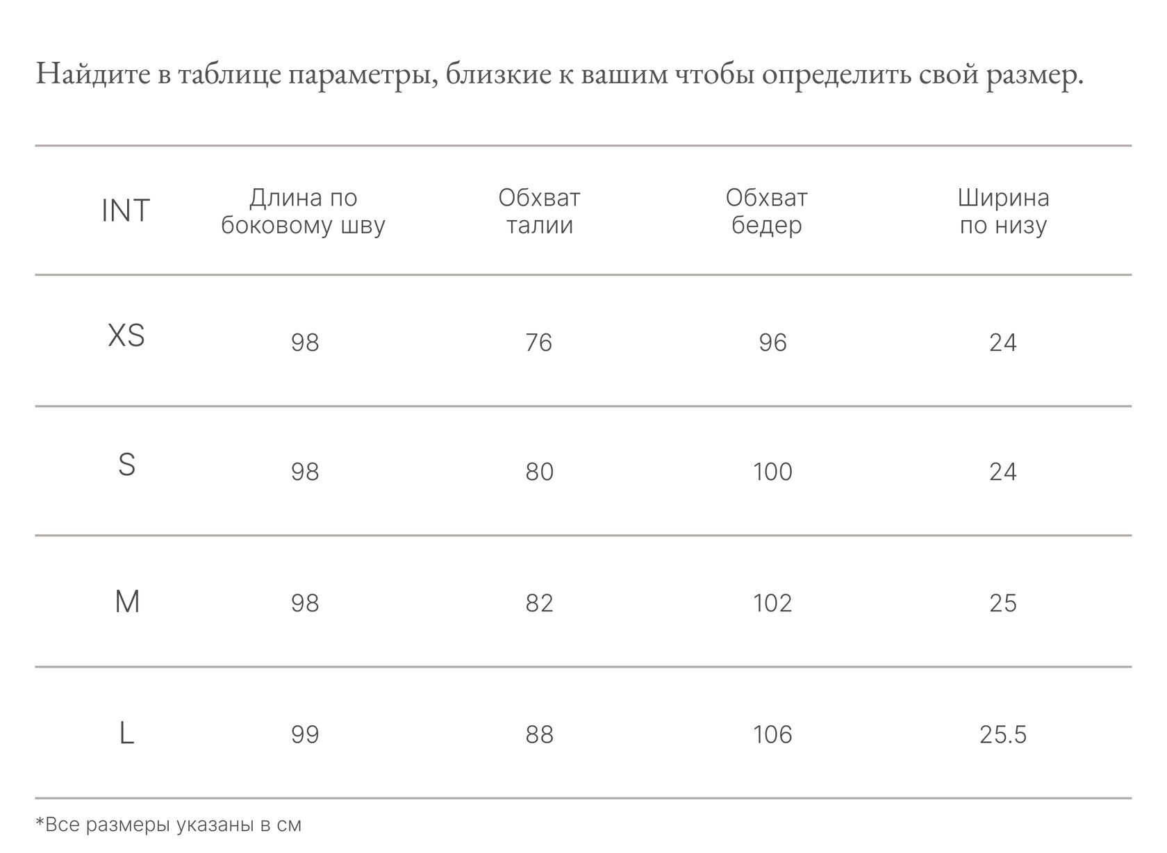 Таблица размеров
