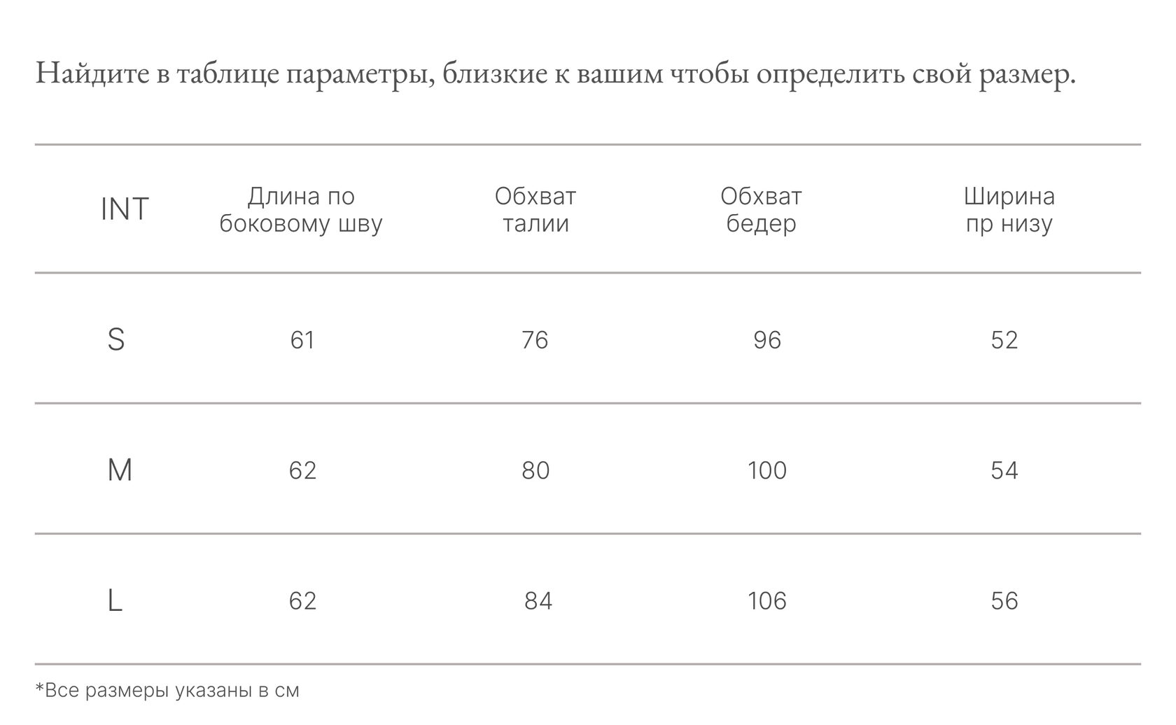 Таблица размеров