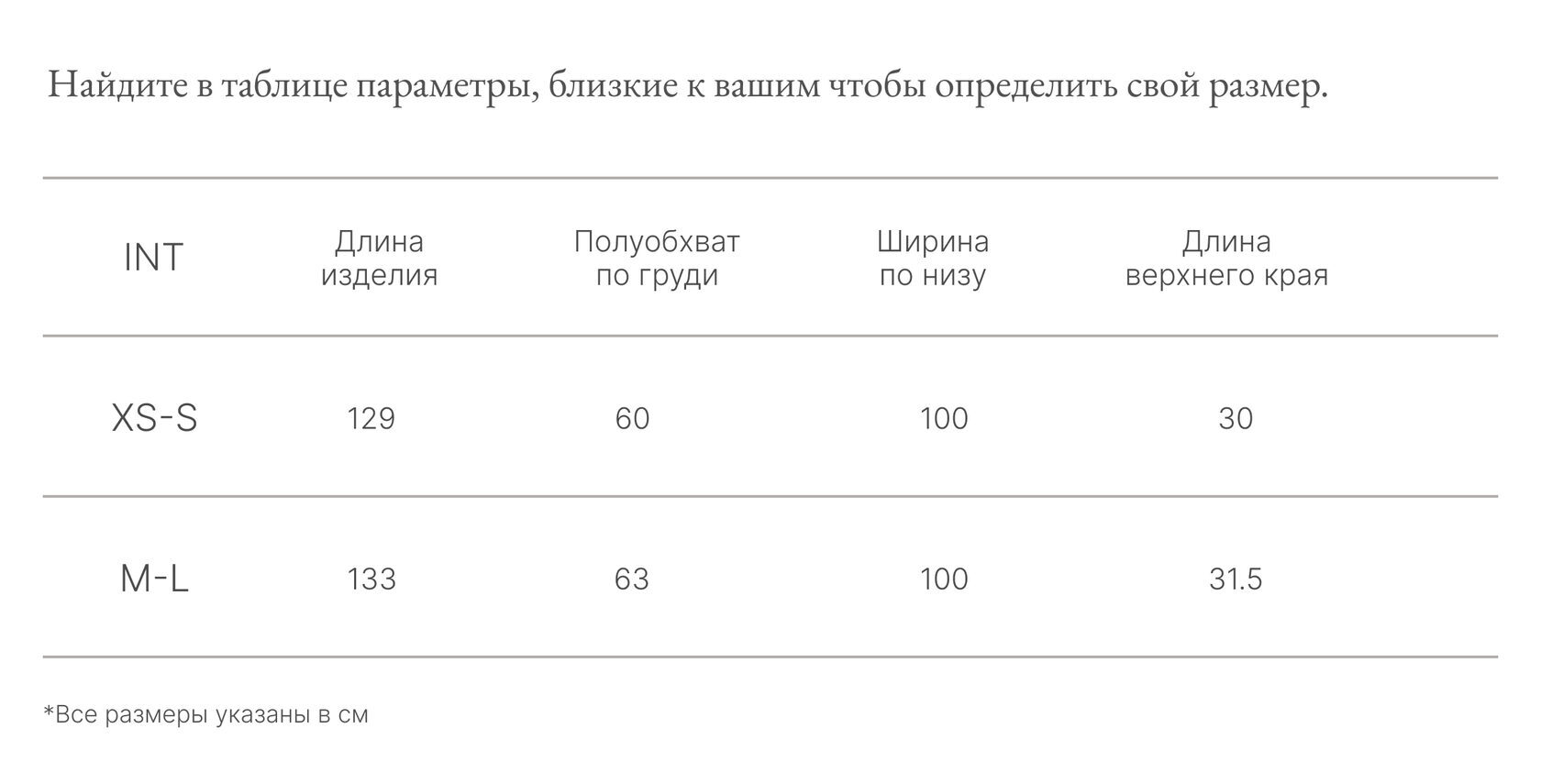 Таблица размеров