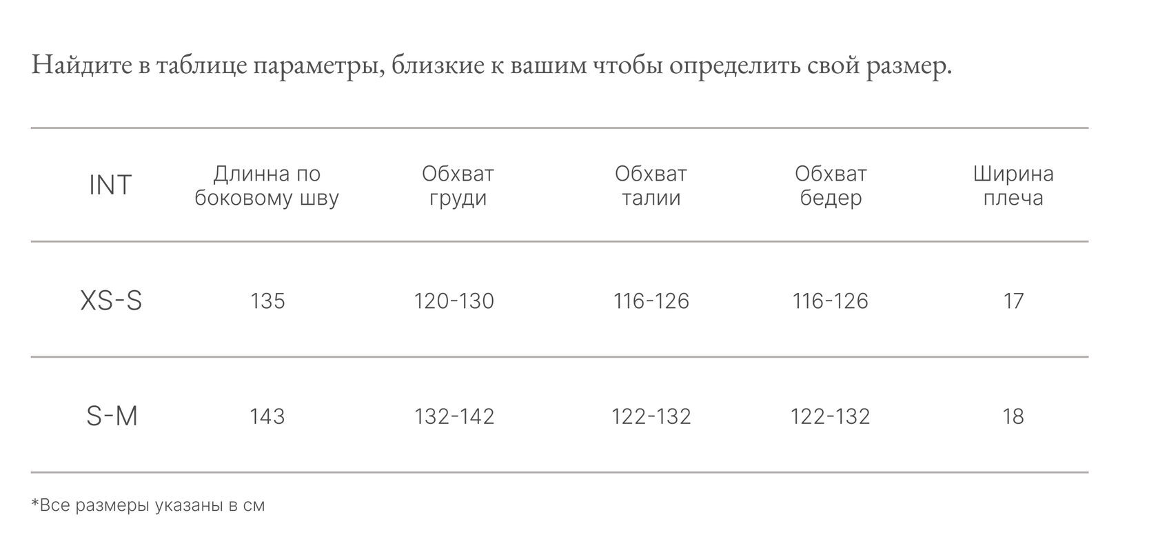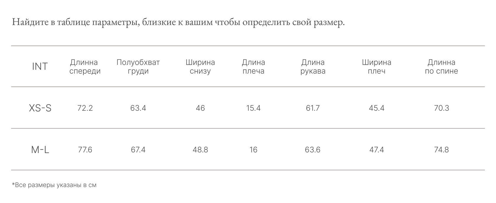 Таблица размеров