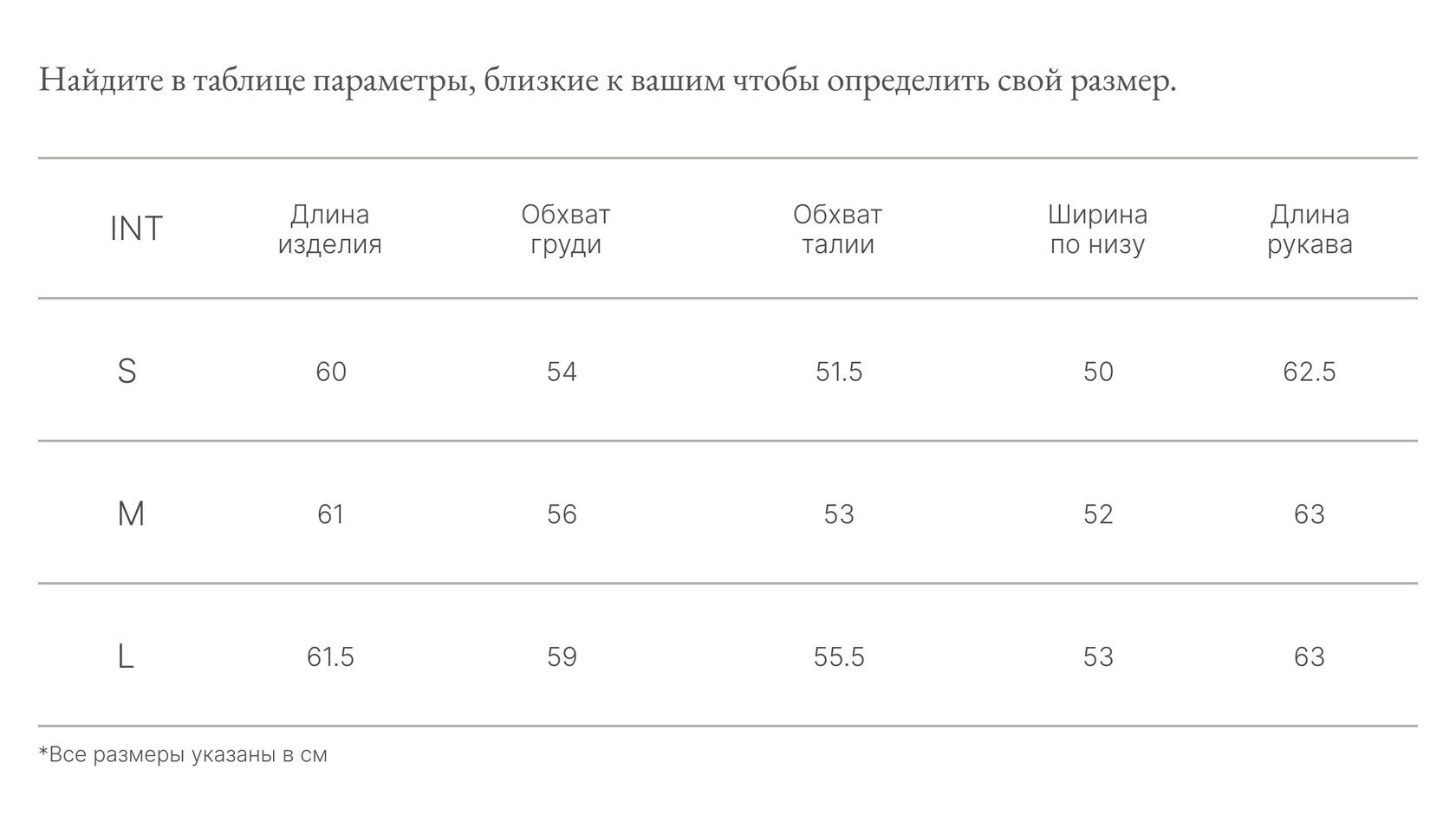 Таблица размеров
